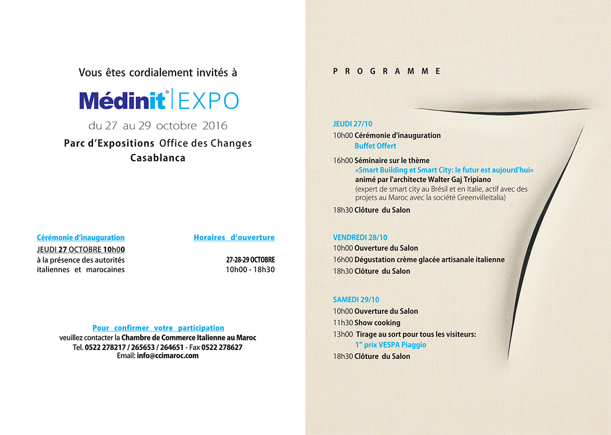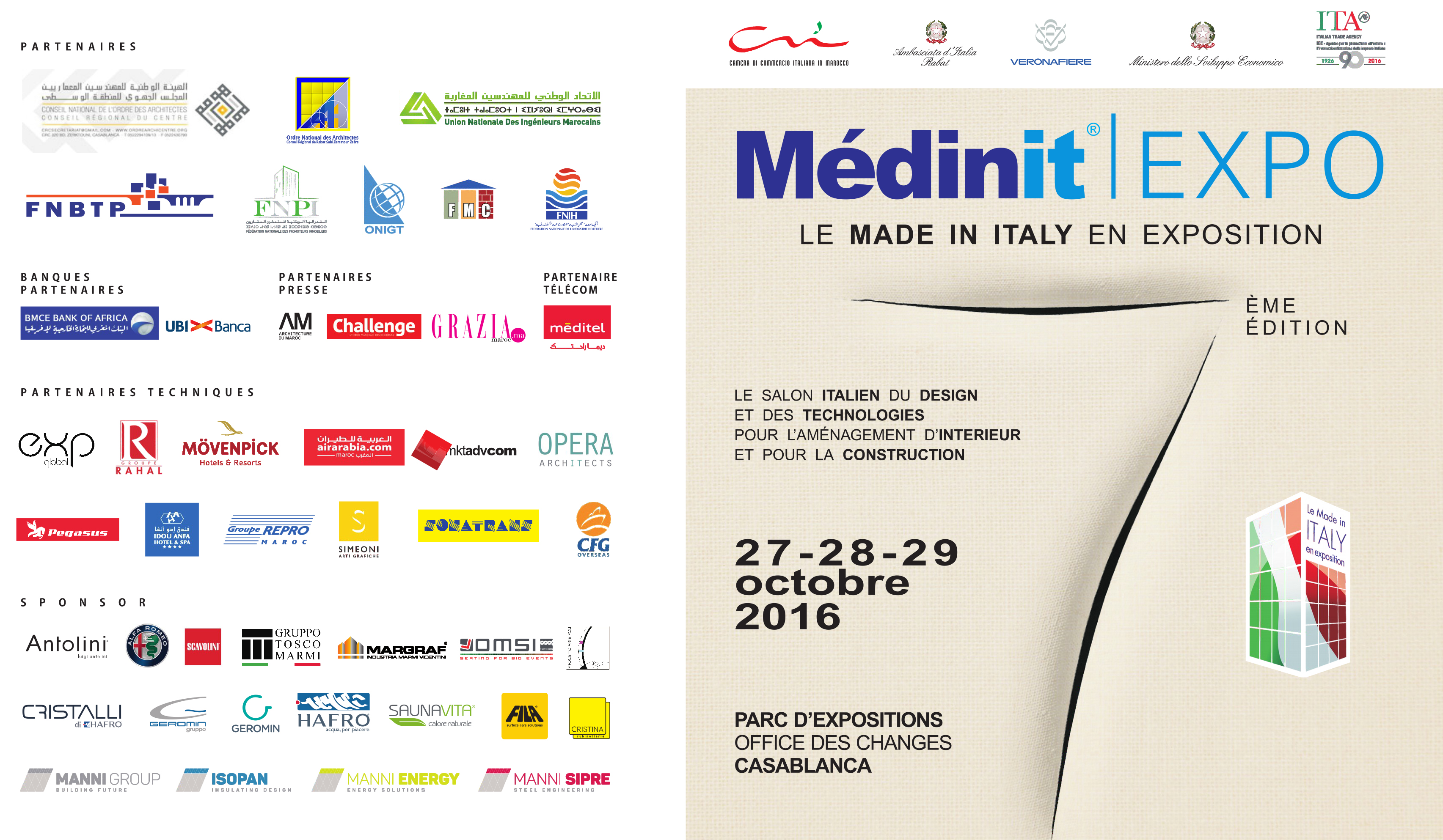 Organisé par la Foire de Vérone avec le patronage de l’Ambassade d’Italie, en collaboration avec la Chambre de Commerce Italienne au Maroc et ICE-Agence Italienne pour le Commerce Extérieur, et en partenariat avec les Conseils Régionaux des Architectes du Centre et de Rabat, la Fédération Nationale du BTP, la Fédération Nationale des Promoteurs Immobiliers, la Fédération des Industries de Matériaux de Construction, l’Ordre National des Ingénieurs Géomètres Topographes, l’Union Nationale des Ingénieurs Marocains, la Fédération de l’Industrie Hôtelière et BMCE Bank, MEDINIT EXPO se propose comme une vraie plateforme de collaboration italo-marocaine pour travailler ensemble dans toute l’Afrique.
