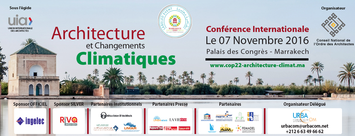 A l’occasion de la COP 22 qui se déroulera à Marrakech, du 07 au 18 novembre, le Conseil National de l’Ordre des Architectes du Maroc, organise sous l’égide de l’Union internationale des Architectes (UIA) une conférence internationale sous le thème « Architecture et changements climatiques : climat du futur ». Cet évènement, initiative conjointe des institutions représentatives de la profession d’architecte dans le monde, se place dans la continuité du thème de la conférence internationale sur « l’architecture et climat » tenu à Paris, à l’occasion de la COP21, à la cité d’architecture et du patrimoine, le 30 novembre 2015. La conférence se déroulera en deux temps :
