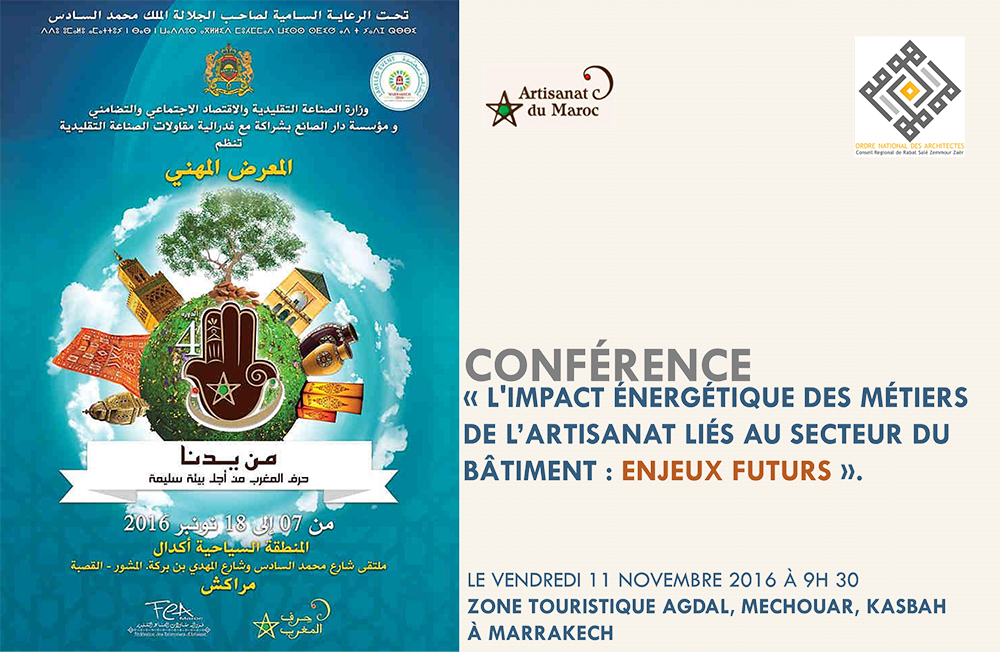 A cette occasion, une conférence en partenariat avec le Conseil Régional de l'Ordre des Architectes de Rabat-Salé-Zemmour-Zaër, est programmée le 11/11/2016 à 9h30 sous le thème « L'impact énergétique des métiers de l’artisanat liés au secteur du bâtiment : ENJEUX FUTURS »