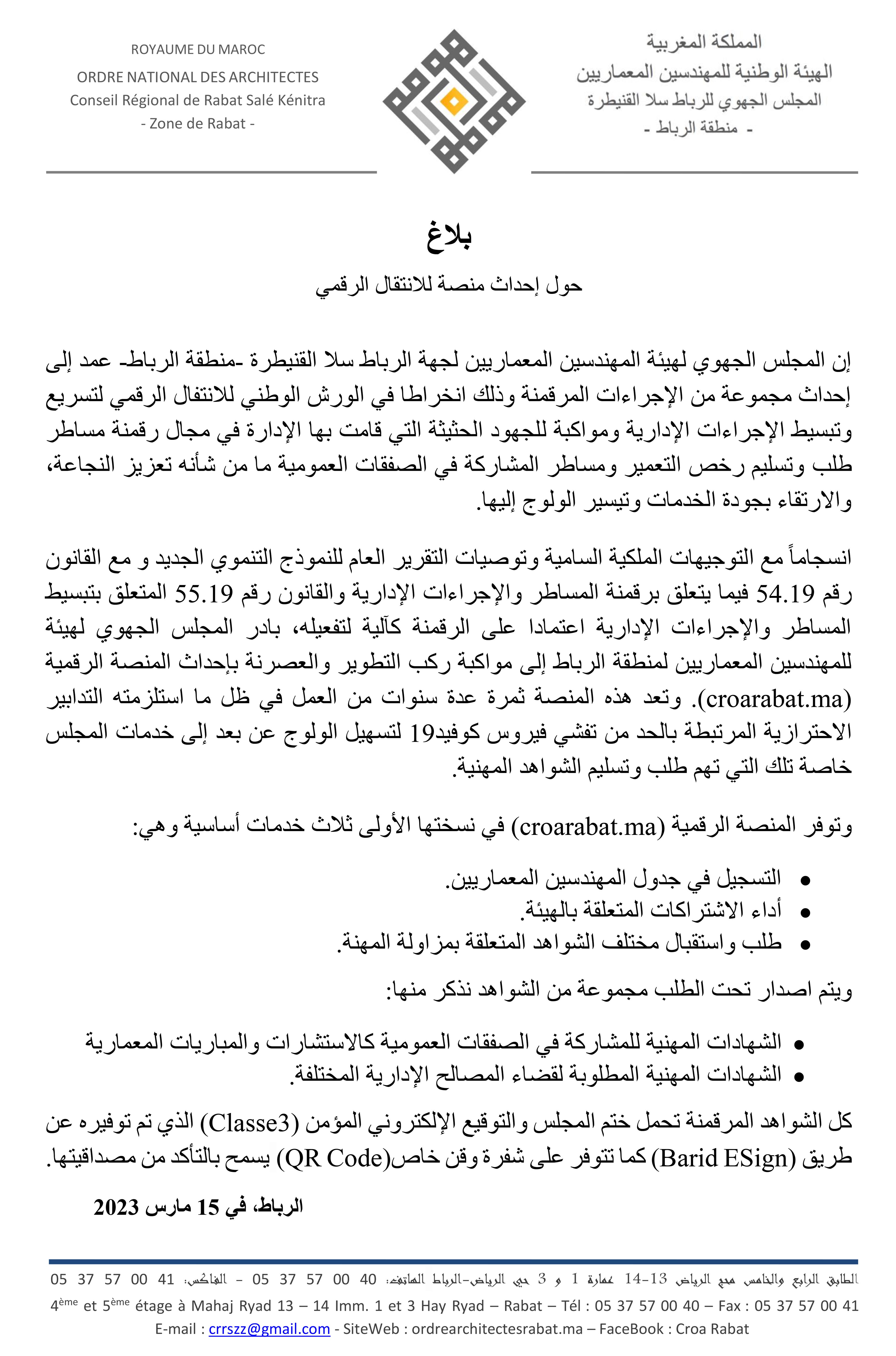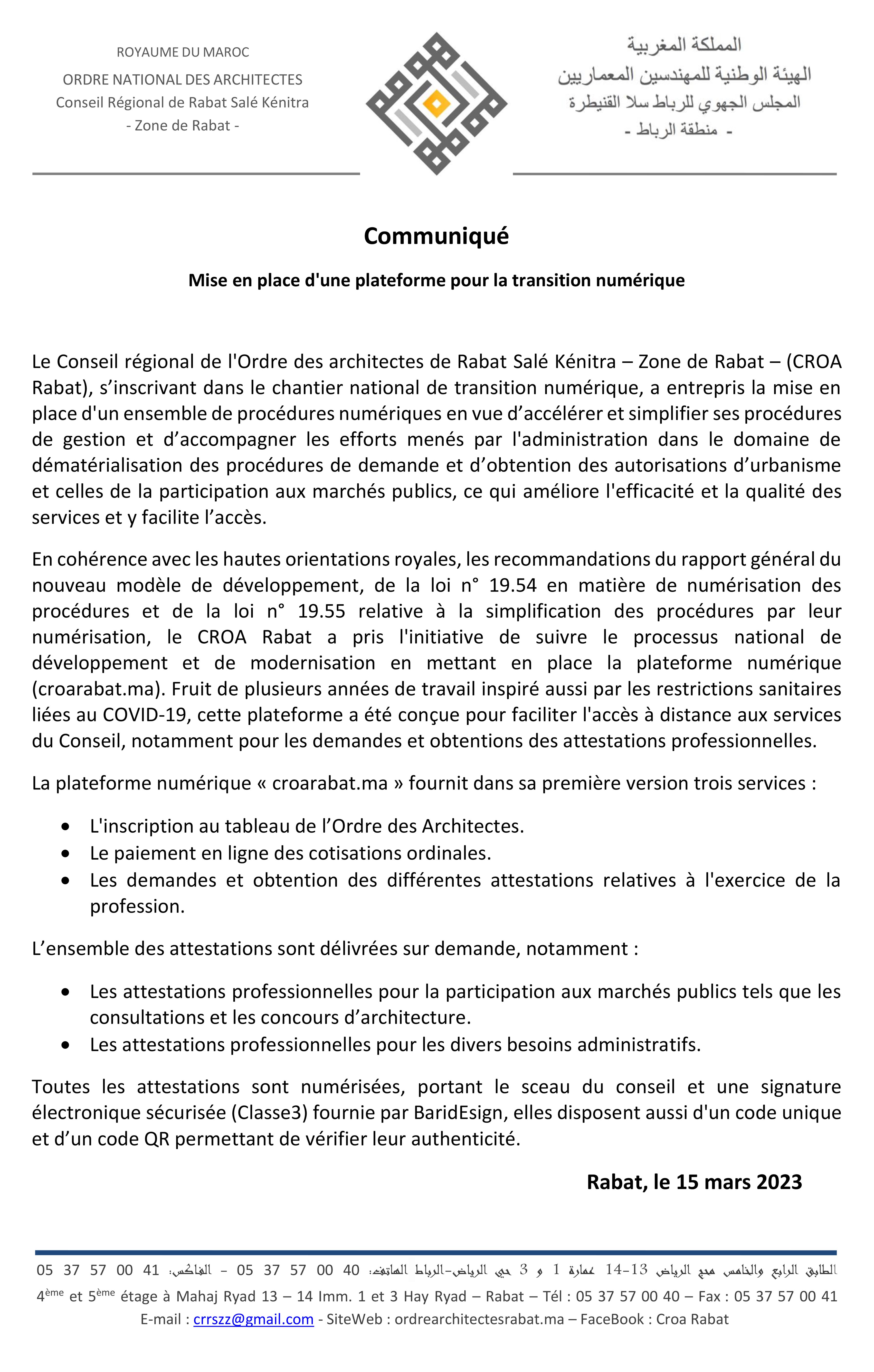 Le Conseil régional de l'Ordre des architectes de Rabat Salé Kénitra – Zone de Rabat – (CROA Rabat), s’inscrivant dans le chantier national de transition numérique, a entrepris la mise en place d'un ensemble de procédures numériques en vue d’accélérer et simplifier ses procédures de gestion et d’accompagner les efforts menés par l'administration dans le domaine de dématérialisation des procédur