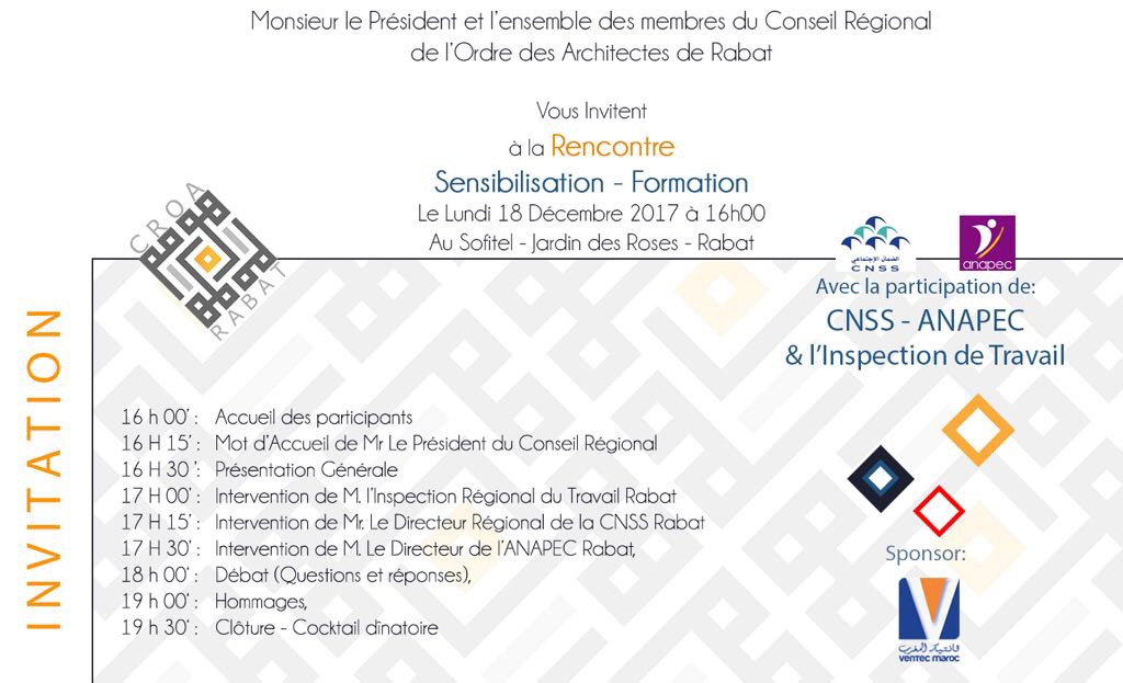 Le conseil régional de l'Ordre des Architectes de Rabat a organisé le 18 Décembre 2017 une rencontre de sensibilisation et de formation, en partenariat avec la CNSS, l'ANAPEC et l'Inspection du Travail.